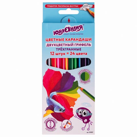 Карандаши цветные с двухцветным грифелем ЮНЛАНДИЯ “МОРСКИЕ ЖИТЕЛИ”, 24 цв, 12 шт, нат.дерево, 181587