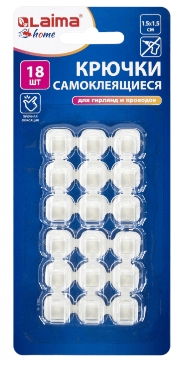 Крючки самоклеящиеся для гирлянд и проводов 1,5х1,5см, КОМПЛЕКТ 18 шт., LAIMA Home, 608795