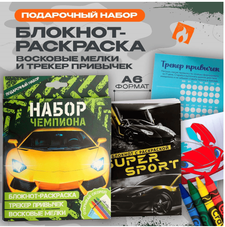 Набор: блокнот-раскраска А6, трекер привычек и восковые мелки “Чемпиону” 9891775