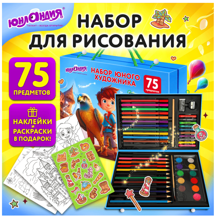 Набор ЮНОГО ХУДОЖНИКА “ОРЕЛ” для рисования и творчества в кейсе ЮНЛАНДИЯ, 75 предметов, 665674