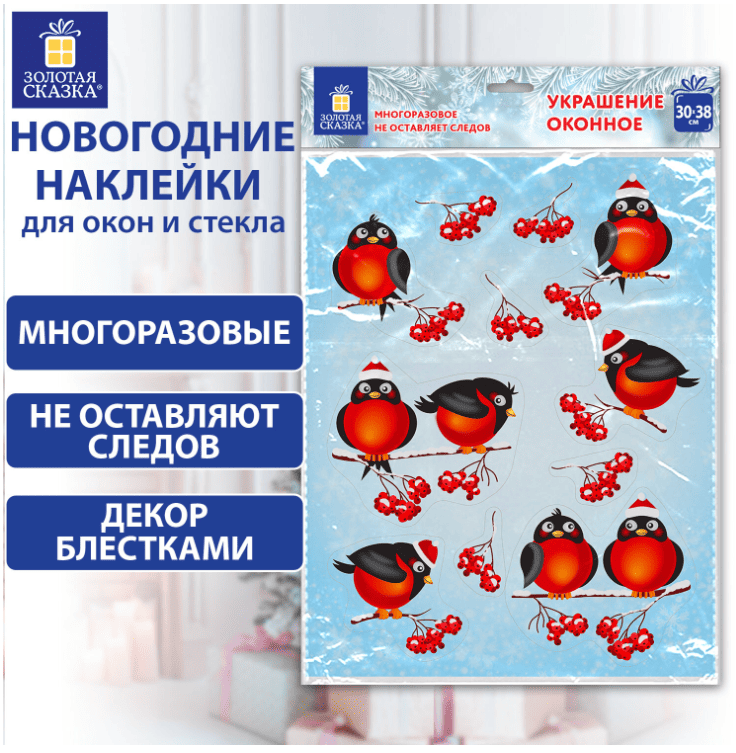Наклейка для окон двусторонняя МНОГОРАЗОВАЯ 30*38см “Снегири”, ЗОЛОТАЯ СКАЗКА, 591185