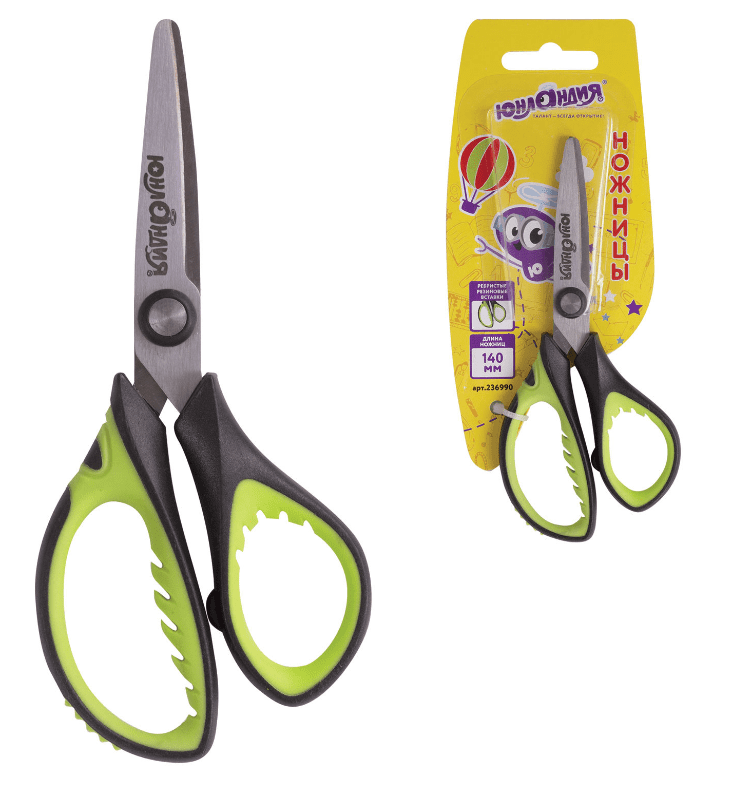 Ножницы ЮНЛАНДИЯ “BASIC”, 140 мм, ребристые резиновые вставки, черно-салатовые, европодвес, 236990