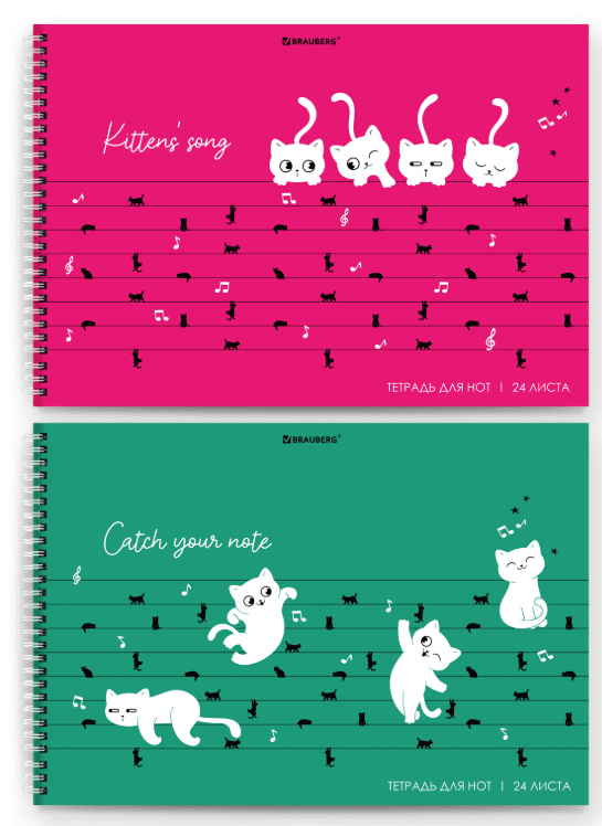 Тетрадь для нот А4 24л, обложка мелов. картон, горизонтальная, на гребне, BRAUBERG, Котики, 404641