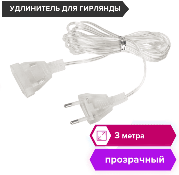 Удлинитель для электрогирлянд 3 м, прозрачный шнур, пакет, ЗОЛОТАЯ СКАЗКА, 591712
