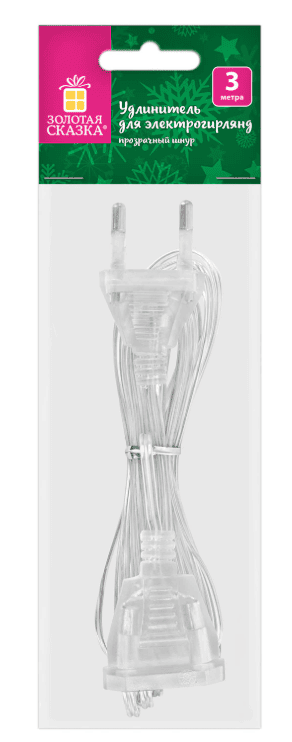Удлинитель для электрогирлянд 3м, прозрачный шнур, пакет, ЗОЛОТАЯ СКАЗКА, 592554