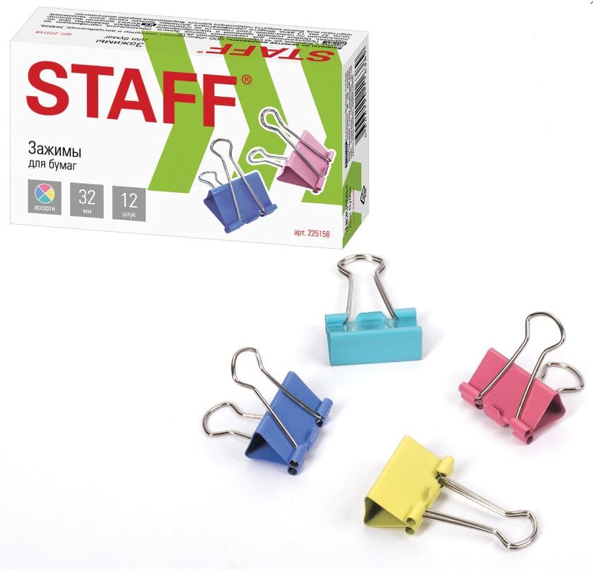 Зажимы для бумаг STAFF Profit, цена за 1 шт.,32 мм, на 140 листов, цветные, карт.кор., 225158